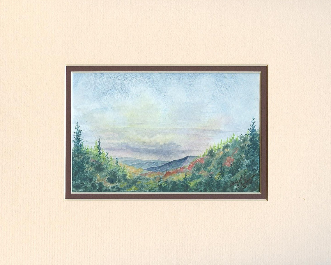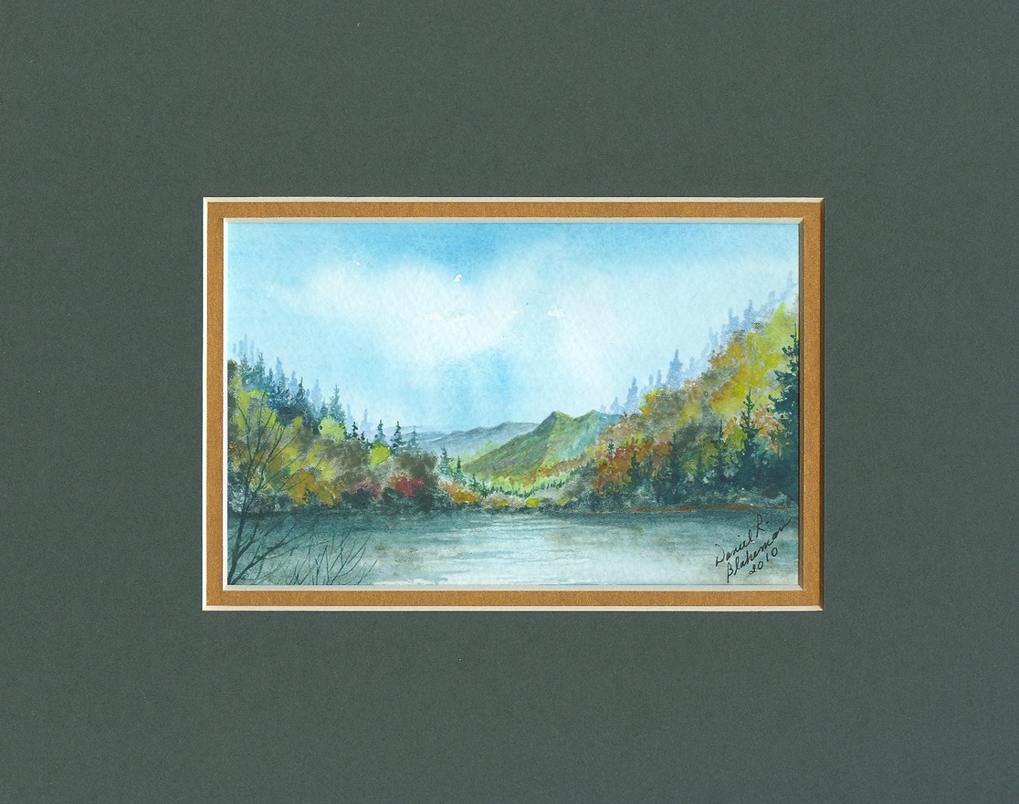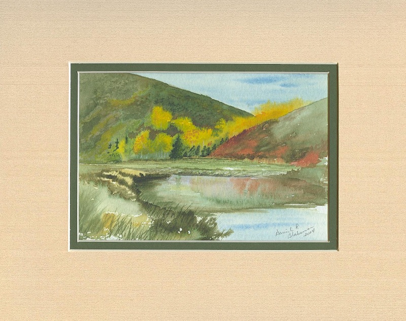Original watercolor 8 in. x 10 in. matted. Top matte is a beautiful deep green, with a rich gold inner boarder, complimenting this tranquil mountain scene. Art work is approximately 4 in. x 6 in., nicely detailed.