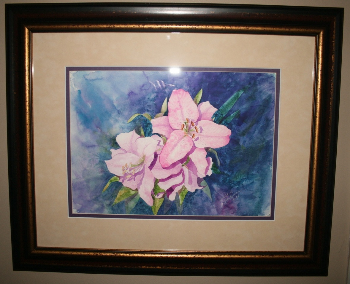 Original watercolor framed measures 19 in. H x 23 in.W. Art work is framed with a beautiful soft eggshell top matte, complimented with the purple inner boarder. Framing by Artworks Gallery, Sevierville, Tennessee. Art work is approximately 10 in. x 14 in.