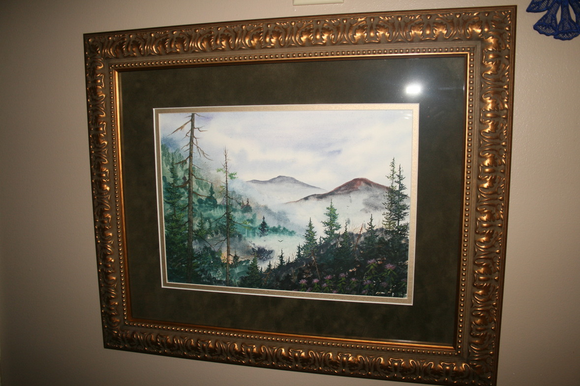 Original watercolor matted and framed by Artworks Gallery, Sevierville, Tn. Framed art work measures 23 1/2 in.x 19 1/2 in. with a dark green top matte, with antique gold inner boarder. The thick gold frame makes the painting stand out without a doubt. Art work is approximately 10 in. x 14 in.
